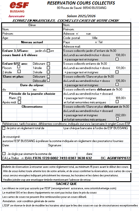 Ne sont pas inclus dans le prix des cours: les remontées mécaniques, les équipements et le matériel de ski.